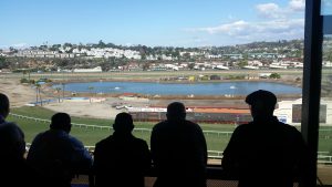 Originally scheduled for Thursday Nov. 21, the Del Mar Thoroughbred Club officials announced suspension out of caution for the horses’ safety as the forecasted rain would likely make the Del Mar Fairgrounds’ dirt and grass tracks unsuitable for racing. This would be the first closure of the track in their 88 year history! Fortunately, 95% of the scheduled attendees were able to attend on Friday Nov 22nd; from downpours Thursday to Blue Skies Friday – made for a beautiful day. Beverages and conversation started flowing at 11 a.m., lunch was served at 11:30, first post was 12:30 p.m., betting was active, and cheering for favorite horses was lively and loud.